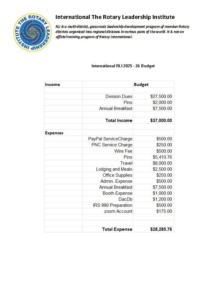 Financial Statement opening paragraph: In accordance with Rotary Leadership Institute International Policy, the following financial statement of the RLI International Treasury is posted. This statement is for an entire Rotary year.